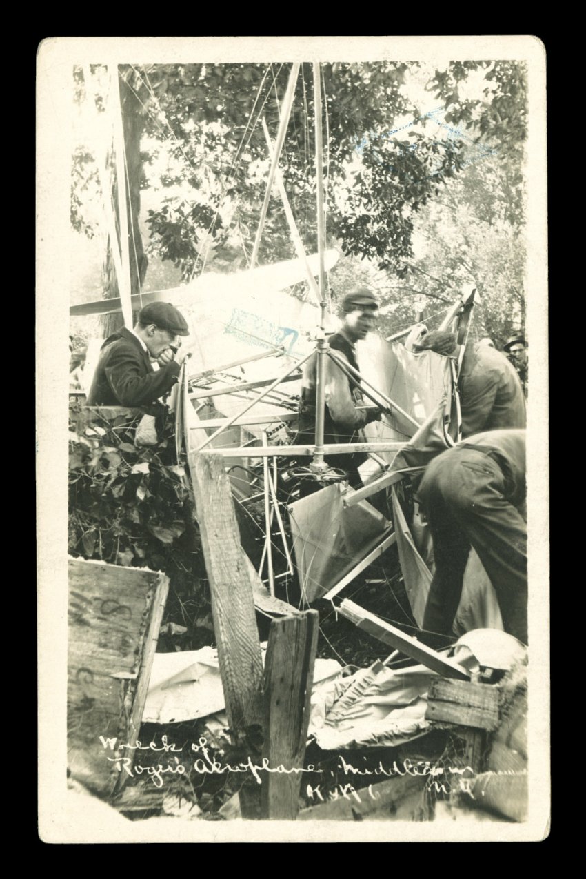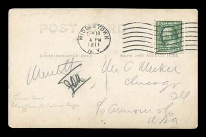 1 c imageCrash of the "Vin Fiz" at Middletown, NY on September 18, 1911, photographic post card showing Rodgers and his mechanics rummaging through the wreckage of his Wright Model EX after having crashed in Middletown, NY following his attempted take-off, inscribed "Wreck of Roger's [sic] Aeroplane, Middletown, N.Y. 1911", address side franked with 1c Green Franklin and tied by "Middletown, N.Y./Sep 18, 1911" wavy line machine cancel, no message written on card, however it has been initialed by three individuals, including James Dunn, the chauffer to C. Meekel of Armour & Co., the sponsors of the "Vin Fiz" flight, very fine; the only recorded card postmarked on the day of the Middletown crash; an amazing same-day-produced picture post card "commemorating" the crash; Rodgers continued his flight on September 21 after making the necessary repairs. (imagea) (Image) Est. 1,000-1,500