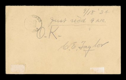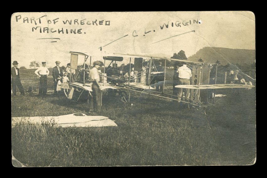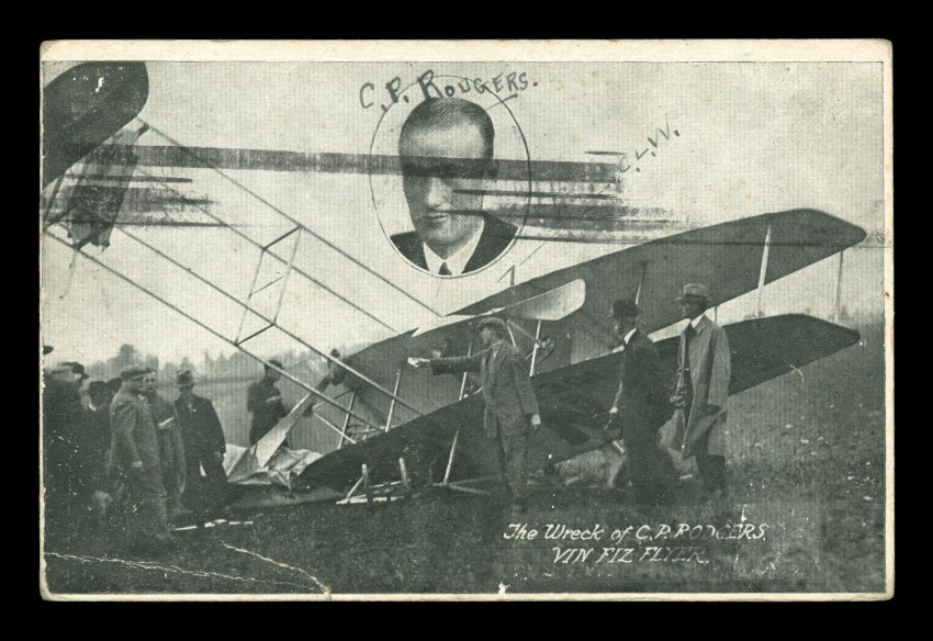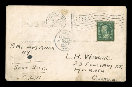 2 c image1911/Aerial/Rodgers/Post/1911" Type 1 circular handstamp, well struck on address side of photographic post card illustrating the wrecked "Vin Fiz", noted in his own hand on the picture side "Part of wrecked machine" and "C.L. Wiggin" (mechanic), with arrow drawn pointing out himself and other mechanics examining the wreckage, 1c Green Franklin tied to card by "Salamanca, N.Y./Sep 25, 1911" waving flag machine cancel, addressed by Wiggin to L.A. Wiggin in Atlanta, with his brief message "Salamanca, N.Y. Sept 24th, C.L.W.", card with minor toning and light creases, fine; believed to be the only example known of the Type 1 circular handstamp from this famous transcontinental flight (the only one used alone - see next lot). (imagea) (Image) Est. 5,000-7,500