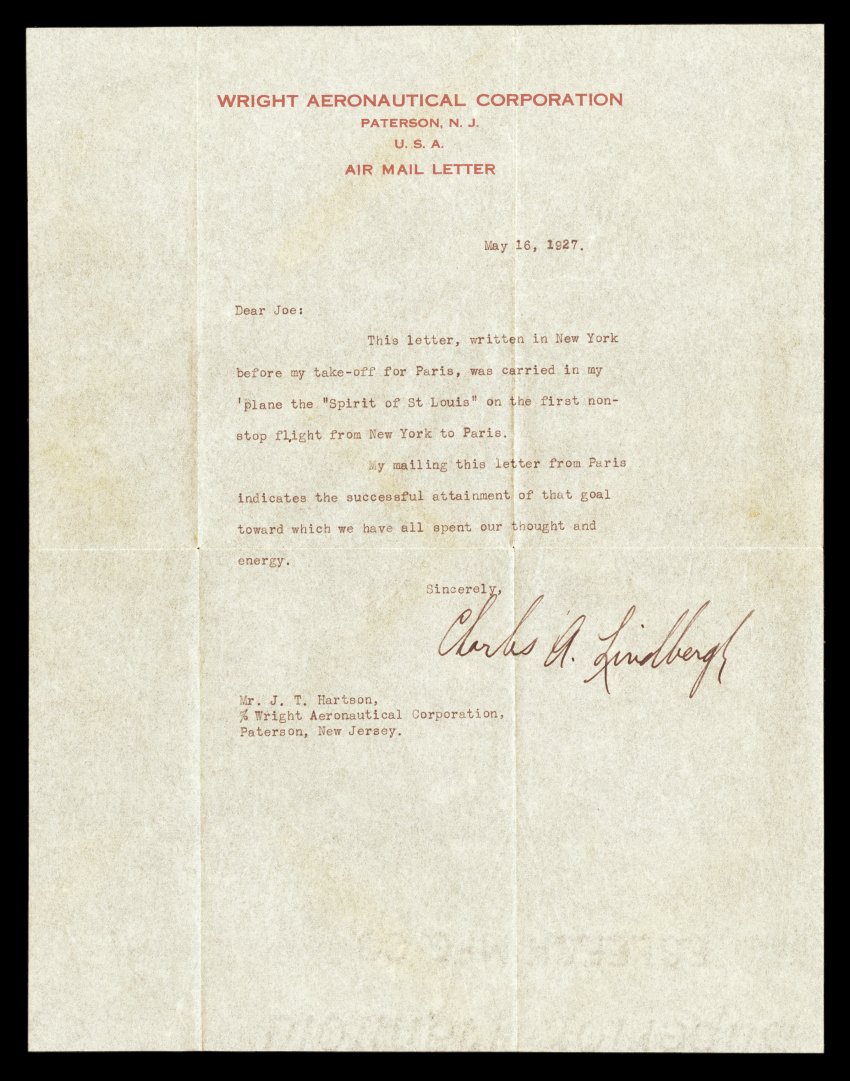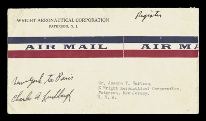 12 c imageCharles A. Lindbergh - a remarkable cover and original letter enclosure carried personally by Lindbergh on his historic non-stop transoceanic flight from New York to Paris, May 20-21, 1927, aboard the "Spirit of St. Louis"; cover with red and blue "Air Mail" printed design and with corner card imprint of "Wright Aeronautical Corporation, Paterson, N.J.", typewritten address to "Mr. Joseph T. Hartson/% Wright Aeronautical Corporation/Paterson, New Jersey/U.S.A.," personally signed "New York to Paris/Charles A. Lindbergh" and additionally marked "Register" in his own hand at top right; original letter enclosure accompanies, which is a typewritten letter signed "Charles A. Lindbergh" on Wright Aeronautical Corporation stationery which reads: "This letter, written in New York before my take-off for Paris, was carried in my plane 'Spirit of St. Louis' on the first non-stop flight from New York to Paris. My mailing this letter from Paris indicates the successful attainment of that goal toward which we have have all spent our thought and energy", cover and letter were mailed back to the U.S. in a larger diplomatic pouch envelope with French postage (which does not accompany this lot), very fine.Lindbergh was accustomed to carrying fairly large quantities of mail on his many famous flights within the U.S., flying under contract for the United States Post Office Department. But his planned non-stop flight from New York to Paris was different. He was well aware of the risks and hazards of such an unheard of attempt. Lindbergh was quite concerned over the weight of his aircraft, the "Spirit of St. Louis", as he had to conserve fuel at all costs, including sacrificing his own personal comfort and safety. This included the removal of even his forward window for the flight, as well as leaving behind almost all equipment that was not determined to be absolutely essential. Therefore, the carrying of any kind of quantity of mail was completely out of the question. To date, only four pieces of mail have been recorded to have been personally carried on this historic flight, this particular cover and letter to his colleague, Joseph T. Hartson, being one of the four. In addition to these four pieces of mail, he is reported to have also carried six letters of introduction and a business card.The historical significance of this cover and original enclosure cannot be overstated. Together they clearly represent one of the most important postal history artifacts of the 20th century, as well as being one of the most important pieces of Americana not already housed in a museum. (imagea) (Image) Est. 75,000-100,000
