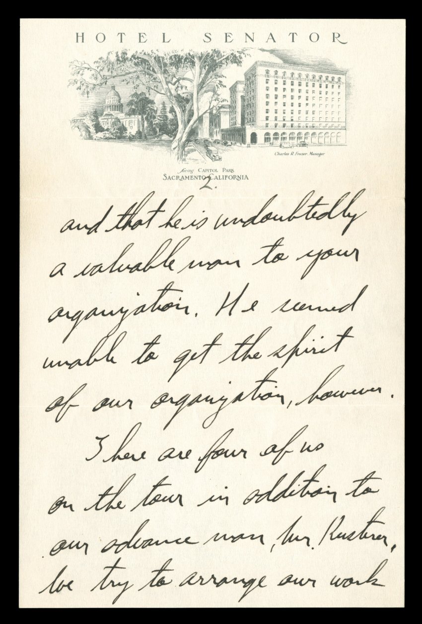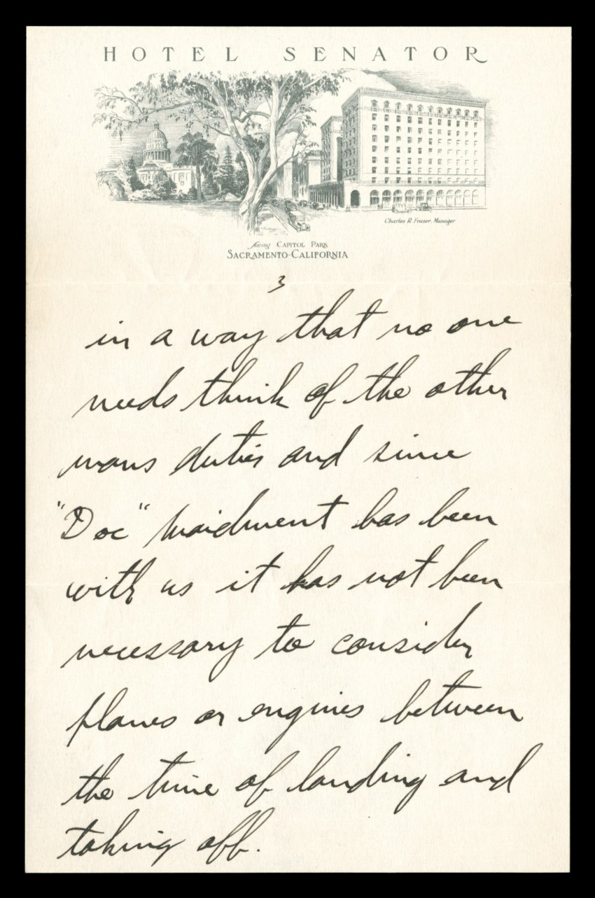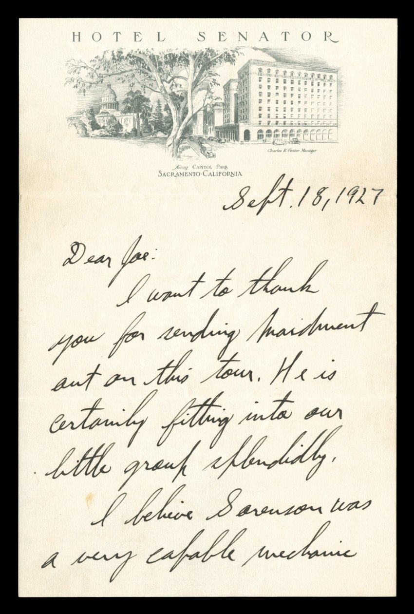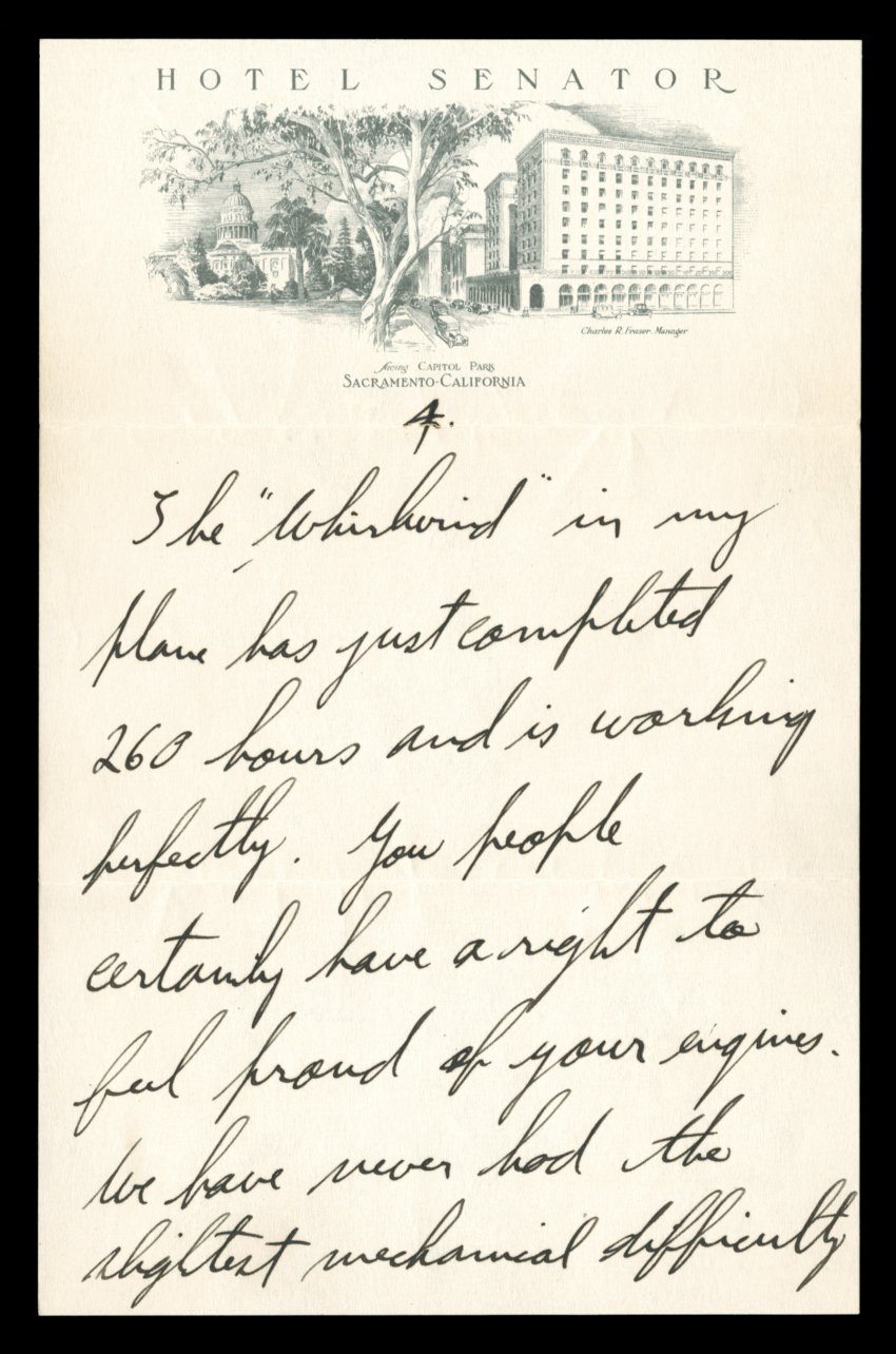13 imageCharles A. Lindbergh, five-page letter signed, a wonderful letter dated "Sept. 18, 1927" and written completely in his own hand on Hotel Senator stationery from Sacramento, Cal., the letter reads, in part, The 'Whirlwind' in my plane just completed 260 hours and is working perfectly. You people certainly have a right to feel proud of your engines. We have never had the slightest mechanical difficulty with either plane," accompanied by original cover franked with a 10c Map stamp (#C7) which is addressed to Joe Hartson in care of the Wright Aeronautical Corporation, very fine and handsome; this letter was written by Lindbergh during his goodwill tour of the U.S. following his famous New York to Paris flight. (imagea) (imageb) (imagec) (imaged) (Image) Est. 3,000-4,000