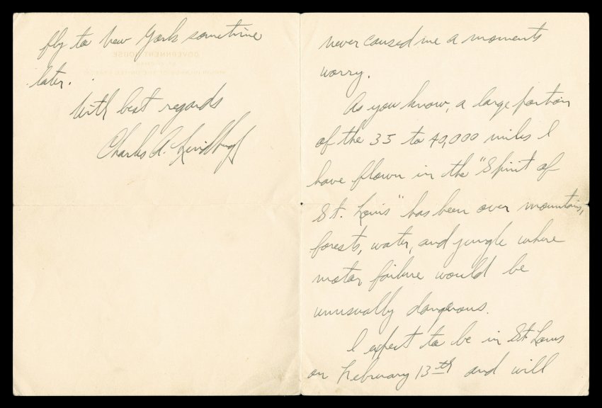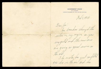 14 imageCharles A. Lindbergh two-page letter signed, a fascinating and important two-page handwritten letter dated "Feb. 1, 1928" on stationery from the Government House in St. Thomas, Virgin Islands, the letter reads Dear Joe: Mr. Voorhees changed the valves in my engine as you suggested and the new ones are giving as good service as the old. The motor has just completed 446 hours in the air and has never caused me a moment's worry. As you know, a large portion of the 35 to 40,000 miles I have flown in the 'Spirit of St. Louis' has been over mountains, forest, water and jungle where motor failure would be unusually dangerous. I expect to be in St. Louis on February 13th and will fly to New York sometime later. With best regards, Charles A. Lindbergh., very fine; also accompanied by original cover addressed to Joe Hartson at Wright Aero Corp. (cover with wear); an exceptional handwritten letter by Charles A. Lindbergh, discussing the "Spirit of St. Louis", written during his goodwill tour of Latin America. (imagea) (Image) Est. 7,500-10,000
