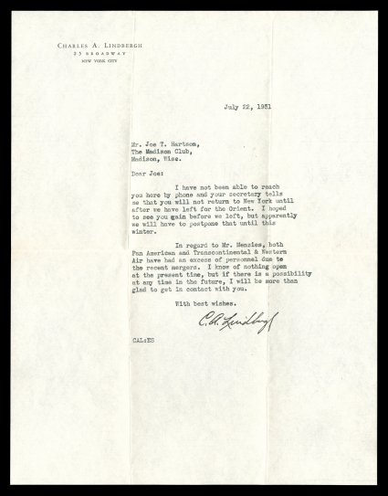 15 imageCharles A. Lindbergh, single page typewritten letter signed, his signature C.A. Lindbergh on letter dated July 22, 1931, accompanied by a cover addressed to Joe Hartson in Madison, Wis., cover postmarked "Hudson Terr. Annex N.Y., Jul. 22, 1931", letter folded only slightly affecting signature, very fine. (Image) Est. 500-750