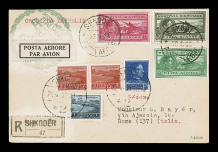 17 c Sieger #207 imageSieger #207, 1933 Italian Flight, attractively franked card for this popular Italian Flight with seven adhesives tied by "Shkoder/Posta Aerore/22. 5. 33" c.d.s., posted on the flight around Rome through the Italian post office (should be Sieger #208) with blue green Italian flight cachet, backstamped with Rome machine cancel, very fine; this is probably the rarest of the Albania treaty-state postings, Sieger lists this under the general number 207 for the Italian Flight but this did not connect through Friedrichshafen at the beginning of the flight, but in Rome for the flight around Rome which Michel prices as rare for any of the few treaty states that posted covers on this leg of the flight (Sieger €650 as #207; Michel #303A; €2,500 for this specific posting). (Image) Est. 1,500-2,000