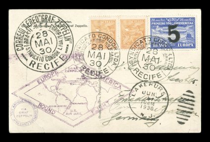 18 c Sieger #59K imageSieger #59K, 1930 Pan-American Flight, a spectacular example of the Parahyba Provisional, attractive photo card of the Zeppelin just after landing, franked with 20,000r Blue Zeppelin issue with bold "5" handstamped surcharge, tied along with 200r Orange pair by "Syndicato Condor Ltda/Servico Aereo No Brazil/Recife/28 Mai 30" air post c.d.s., large Recife Zeppelin cachet at left and violet American flight cachet, addressed to Friedrichshafen and also bearing a Lakehurst duplex of June 1, 1930 plus the small circular "Round-Trip" cachet, very fine and quite choice.Originally three basic values of the Zeppelin series intended for use on the Pan-American Flight were produced, with some additionally overprinted "Graf Zeppelin/U. S. A.". It soon became apparent that there was a shortage of the lower values, particularly the 5,000r. Therefore 20,000r values and other Condor stamps were surcharged to meet this shortage. In Parahyba (capital of the province of Parahyba) all the 5,000r stamps had been used, so an order was given to surcharge the 20,000r stamp with a large "5" handstamp. Records show that only 13 stamps were so surcharged with some of them being sold in Parahyba and others forwarded to Recife where they were used.Research continues into the disposition of these thirteen examples. To date three examples are known unused, seven items have been recorded on cover or card with usages at both Parahyba and Recife. One used example has been recorded on a piece. The Recife usage offered here is one of the most attractive usages of the seven recorded items and has long been recognized as an authentic usage of this immensely rare provisional. This offering represents a rare opportunity to acquire one of the world class rarities of Zeppelin philately. The card has been signed by H. W. Sieger and is accompanied by his 1964 certificate as well as a 1964 Robson Lowe certificate; ex-Kofler. (Image) Est. 50,000-75,000