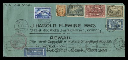 19 c Sieger #64I var. imageSieger #64I var., 1930 Pan-American Flight, a most interesting large mixed franking cover with five adhesives of Canada including 20c Carmine special delivery (small perf. faults to one stamp), all tied by "Regina/Sask./AP 24 30" c.d.s., in mixed franking with German 2M South America Flight Zeppelin single tied by "Luftschiff/Graf Zeppelin/19. 5. 1930" c.d.s., flown on the leg from Friedrichshafen to Seville on the outbound portion of the flight, red German flight cachet and backstamped with the Seville machine cancel, returned to Saskatchewan, very fine; this unusual posting is totally unlisted by Sieger or Michel, both catalogs list covers posted from Canada through the United States on the return flight from Lakehurst to Friedrichshafen, either with or without United States Zeppelin stamps, but neither list a cover through Germany on the outbound portion of the flight; this cover came about because the sender addressed it to the Chief Post Master in Friedrichshafen rather than the post office at Lakehurst, his instructions were that it fly by the Zeppelin to Lakehurst and then back home, however the postage he used was insufficient to pay for a cover on even the shortest leg of this flight, so when it was put on the Zeppelin the on-board postmaster gratuitously applied a 2M Zeppelin stamp and flew it as far a Seville (the Zeppelin Company seems to have been generous to collectors who were unaware of how to send their mail on this first important international flight); extremely rare and it may well be unique as we have not seen another (Michel #62c). (Image) Est. 3,000-4,000