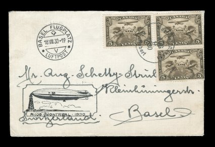 20 c AAMC #Z-462 imageAAMC #Z-462, 1930 Return of the Dirigible R-100 from Montreal (St. Hubert) Canada, an attractive cover with a single and pair of the Canada 5c Brown first air post (nibbed perfs. to the bottom stamp of the pair from being affixed slightly over the edge) neatly tied by "Montreal, Canada/St. Hubert/Aug 13 1930" c.d.s., black R-100 cachet that was applied to souvenir covers of this flight, posted to Basel, Switzerland with "Basel Flugplatz/Luftpost/18. VIII. 30" receiving c.d.s. on the front, very fine; there was no officially sanctioned mail carried on this flight, but despite not being carried on the R-100 this is a very scarce cover. (Image) Est. 400-500