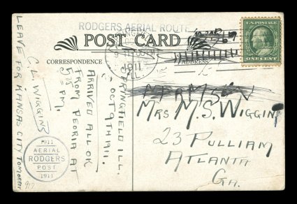 3 c image1911/Aerial/Rodgers/Post/1911 Type 1A circular handstamp, used in conjunction with straight line "RODGERS AERIAL ROUTE" handstamp in matching ink on the reverse of a lithographic picture post card of Rodgers at one of his wreck scenes, franked with 1c Green Franklin and tied by "Springfield, Ill./Oct 9, 1911" machine cancel (actually an important day in the history of the "Vin Fiz" stamps created by Rodgers' wife, Mabel, who on that day reportedly received a telegram from the Postmaster General Hitchcock appointing her an official postmistress - giving her stamps potentially more of an "official" status - but a copy of the telegram has never been found), message written by C.L. Wiggin "Springfield Ill. Oct 9th 1911. Arrived all OK from Peoria at 5:25 PM, C.L. Wiggin. Leave for Kansas City tomorrow" and addressed to M.S. Wiggin in Atlanta, very fine; the only recorded example of the Type 1A handstamp on cover. (imagea) (Image) Est. 5,000-7,500