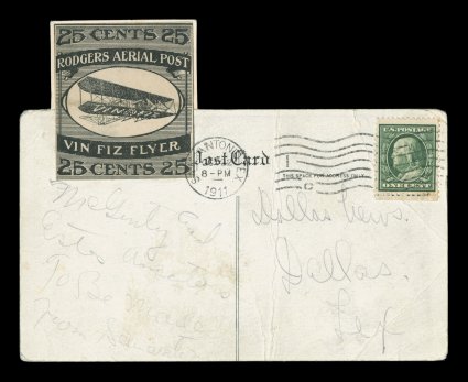 4 c CL2 image#CL2, 25c Black, Rodgers "Vin Fiz" semi-official air post, cut close as always, affixed over top left edge of the address side of a flown souvenir post card (stamp was originally folded over on to the back side of the post card) and tied by by clear "San Antonio, Tex./Oct 22, 1911/8 PM" wavy line machine cancel, cancel also ties 1c Green Franklin, addressed to Dallas, Tex., minor creasing to card not affecting the "Vin Fiz" stamp, overall very fine.The message on the card (reported to have been written by Rodgers' wife Mabel) reads "McGinley and Estes Aviators To Be Mailed From San Antonio." and addressed to the Dallas News. This remarkable card began its journey on the "Vin Fiz" somewhere in Texas (probably Waco, Granger, Austin or Kyle) and made stops in Kyle and San Marcos, Tex, both on October 22, and arrived in San Antonio on the same day. From there it was forwarded by ground transportation to Dallas.One of only eight recorded flown covers bearing the famous "Vin Fiz" semi-official air post stamp, which was used during the first successful transcontinental flight. In addition, this is the only example used from San Antonio, Tex. An important artifact from one of the most pivitol events in aviation history; ex-McCoy, Goodkind, Lettick and O'Sullivan. (Image) Est. 40,000-50,000