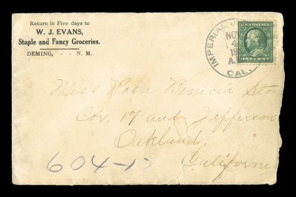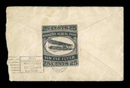 5 c CL2 image#CL2, 25c Black, Rodgers "Vin Fiz" semi-official air post, cut close as always, trivial nick at top, affixed to reverse of flown cover and tied by "Oakland, Cal./Nov 6, 1911/8:30 AM Panama Pacific Exposition in San Francisco 1915" receiving machine cancel, address side with 1c Green Franklin tied by "Imperial Junction, Cal./Nov 4, 1911 A.M." c.d.s., envelope with Deming, N.M. grocer's printed corner card, addressed to a Miss Rosa Benicia Stone in Oakland, Cal., cover opened roughly at right, small tear at bottom and faint water stain, none of which affects the stamps or markings, overall very fine.This cover started its journey on the "Vin Fiz" on October 30 at Deming, N.M., and made multiple stops in: Lordsburgh, N.M. (October 30), Willcox, Ariz. (October 31), Tucson and Maricopa, Ariz. (November 1), Phoenix and Stoval, Ariz. (November 2) and finishing in Imperial Junction, Cal. (November 3). At Imperial Junction it was forwarded to Oakland by ground transportation.A most spectacular usage of the famous "Vin Fiz" semi-official air post stamp, being one of only eight recorded pieces of mail bearing this adhesive . In addition, this is the only "Vin Fiz" stamp known on an envelope - the other seven are on cards - unique in this regard. This cover also has the distinction of having realized the highest price of any of the eight known pieces of mail bearing the "Vin Fiz" stamp, when last offered at auction in March 2002 (Robert A. Siegel Auction Galleries, Inc.). It realized $105,000.00, plus the buyer's premium, for a total of $115,500.00; ex-Mack. (imagea) (Image) Est. 75,000-100,000
