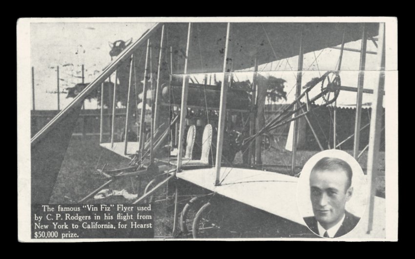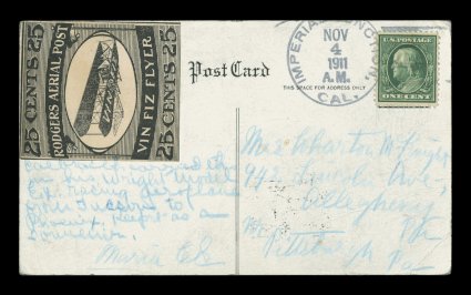 6 c CL2 image#CL2, 25c Black, Rodgers "Vin Fiz" semi-official air post, cut close as always, affixed neatly to the top left portion of the address side of a picture post card depicting the "Vin Fiz" Flyer, along with an inset photo of Rodgers, used in conjunction with a 1c Green Franklin which is tied by clear strike of "Imperial Junction, Cal./Nov 4, 1911/A.M." c.d.s., addressed in blue crayon to a Mrs. Wharton M. Knight in Allegheny, Pa., backstamped "Pittsburg, Pa./Nov 8", trivial edge wear, very fine.The message on the card reads "Calbraith carried this in his Wright model Ex racing aeroplane from Tucson to Phoenix. Keep it as a souvenir." This handsome and amazing flown card began its journey from Tucson, Ariz., on November 1, 1911, with stops in Maricopa (November 1), Phoenix and Stoval, Ariz. (November 2), before finally arriving in Imperial Junction, Cal. on November 3. From there it was forwarded by ground transportation to Pennsylvania.One of only eight flown covers bearing the famous "Vin Fiz" semi-official air post stamp, as well as being one of the nicest quality examples available. In addition to the eight recorded covers, there are only four off cover "Vin Fiz" stamps known. A cover of extraordinary philatelic and historical significance. (imagea) (Image) Est. 40,000-50,000