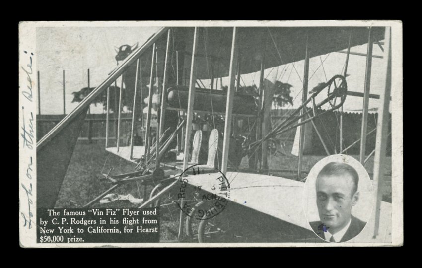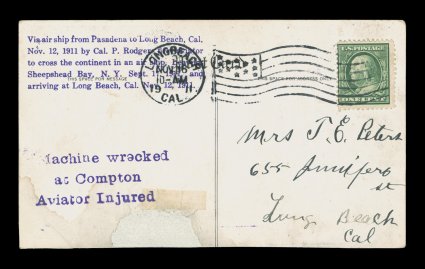 8 c image#AAMC #2c, Crash of Calbraith Rodger's "Vin Fiz" Flyer at Compton, Cal. on November 12, 1911, lithographic post card picturing Cal Rodgers and his "Vin Fiz" Flyer, on the address side is special five-line purple cachet for the flight, plus well struck three-line "Machine wrecked/at Compton/Aviator Injured handstamp, card franked with 1c Green Franklin and tied by bold "Long Beach, Cal./Nov 16, 1911/10 AM" machine flag cancel, addressed to a Mrs. T.E. Peters at Long Beach, bottom of card scuffed (damaged in crash?), otherwise fine.The five-line flight cachet was applied to mail intended to be carried by the "Vin Fiz" on the final leg of the flight, from Pasadena to Long Beach. However, the plane crashed upon takeoff from the stop at Compton, California, leaving Rodgers seriously injured and the plane completely wrecked. The three line "crash" handstamp was then applied. One month later Rodgers had recovered enough to complete the last leg to Long Beach in a totally rebuilt plane.One of only seven recorded covers from the wreck of the "Vin Fiz" at Compton, California. A perfect cover to accompany one of the four "Vin Fiz" covers offered in this auction bearing the special stamp prepared for this first successful transcontinental flight - completing the story of this historic event in early aviation history. (imagea) (Image) Est. 7,500-10,000