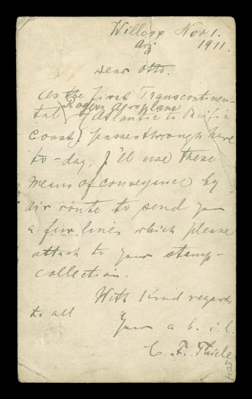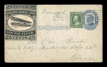 7 c CL2 image#CL2, 25c Black, Rodgers "Vin Fiz" semi-official air post, cut close as always, minor scissor cut at upper right, affixed neatly (and upright) to top left corner of 1c McKinley postal card, additionally franked with a 1c Green Franklin, which is tied by a neat strike of "Pasadena, Cal./Nov 8, 1911/8-PM" machine cancel with Panama-Pacific slogan, addressed to an Otto Hunter in Cologne, Germany, slight creasing at card corners, overall very fine.On the reverse of the postal card is a message from C.F. Threle to his brother-in-law in Germany and reads "Willcox, Arz. Nov. 1, 1911. Dear Otto, As the first Transcontinental Rogers Aeroplane (Atlantic to Pacific Coast) passes through here to-day, I'll use these means of conveyance to send you a few lines, which please attach to your stamp collection. With kind regards to all, Your a.b.i.l [affectionate brother-in-law] C.F. Threle." This card had quite the journey on the "Vin Fiz", beginning in Willcox, Ariz. on November 1, 1911 and making numerous intermediate stops (Tucson and Maricopa, Ariz. on November 1, Phoenix and Stoval, Ariz. on November 2, Imperial Junction, Cal. on November 3, Banning, Cal. on November 4, and Beaumont and Pomona, Cal. on November 5) before arriving in Pasadena on November 5.Of the eight recorded examples of the "Vin Fiz" stamp on flown covers, this cover is perhaps the most remarkable and desirable of all for three unique reasons. First, this is the only stamp known on a flown card that reached the intended west coast destination of Pasadena. Second, this is the only one used on a United States postal card. And, finally, it is the only one used on mail to a foreign destination. A fabulous United States and air post rarity. (imagea) (Image) Est. 50,000-75,000