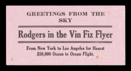9 image"Greetings from the Sky" original "Vin Fiz" promotional slips, a remarkable trio (different versions) of small slips dropped from the plane during its promotional flights across the U.S., according to some sources Rodgers' was none too pleased to have participated in the promotion, one slip in particular has been annotated and dated (September 27, 1911) as having been dropped on a leg from Canisteo to Salamanca, another with pencil note "saw the first one fly Sept. 30 1911", very fine. (imagea) (Image) Est. 2,000-3,000