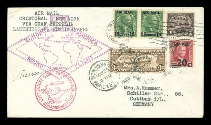 322 c Sieger #64III imageSieger #64III, 1930 Pan-American Flight, mixed franking card with three Canal Zone air posts tied by "Cristobal/Canal Zone/May 15, 1930" machine cancel, flown via Cuba with Havana transit to Lakehurst for the return flight of the Zeppelin from Lakehurst to Friedrichshafen with well centered U.S. 65c Zeppelin tied by "New York, N.Y./Grand Central Sta./May 27, 1930" duplex, red German and violet American return flight cachets, backstamped Friedrichshafen, trivial corner crease, a clean and attractive card, very fine; only 25 cards flown (Sieger €1,600; Michel #68Gb). (Image) Est. 1,000-1,500