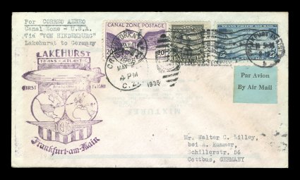 326 c Sieger #409W imageSieger #409W, 1936 First North America Flight of the "Hindenburg", mixed franking cover for the return flight with Canal Zone 20c Violet air post tied by "Critobal/C. Z./May 2 1936" duplex, plus two United States adhesives tied by New York machine cancel and a strike of the Frankfurt Zeppelin machine backstamp (another strike on the reverse), violet United States flight cachet, very fine and scarce; Sieger records only 50 covers flown from the Canal Zone (Sieger #€1,150; Michel #13). (Image) Est. 500-750