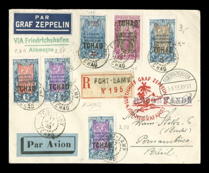 327 c Sieger #223Aa imageSieger #223Aa, 1933 Fourth South America Flight, handsome registered cover with six "Tchad" overprints and surcharges tied by "Port-Lamy/Tchad/17 Mai 33" c.d.s., red flight cachet, Friedrichshafen transit c.d.s., backstamped Pernambuco, very fine; an especially attractive and rare cover of this French colony (Sieger €1,800; Michel #323a). (Image) Est. 750-1,000