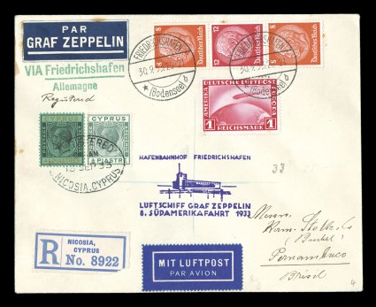 330 c Sieger #235Aa imageSieger #235Aa, 1933 Eighth South America Flight, mixed franking registered cover with two King George V values tied by "Registered/Nicosia, Cyprus/13 Sep 33" oval, plus four German adhesives including 1M Zeppelin single, all tied by Friedrichshafen c.d.s., violet flight cachet, backstamped Pernambuco, small trace of toning affecting a couple of perfs., very fine; despite the variation in catalog prices for the few Cyprus Zeppelin postings, all are rare and are seldom encountered (Sieger €700; Michel #343a). (Image) Est. 750-1,000