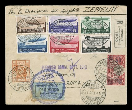 334 c Sieger #212G imageSieger #212G, 1933 Italian Flight, rare registered full Zeppelin set cover with all six values plus two other adhesives tied by "Bengasi/Posta Aerea-Zeppelin/25 5 33" c.d.s., flown on the flight around Rome, violet Italian flight cachet, backstamped with the Rome machine cancel, unobtrusive vertical fold not affecting the stamps or markings, very fine; an exceptionally rare cover with the complete Zeppelin set and only a few made; signed A. D(iena), Bolaffi (Sieger €2,000; Michel #303Ea). (Image) Est. 1,000-1,500
