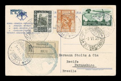 335 c Sieger #212K imageSieger #212K, 1933 Italian Flight, registered multicolor air card with 10L Green Zeppelin single along with two other adhesives of Lybia tied by scarcer violet "Tripoli/Posta Aerea-Zeppelin/29. 5. 33" c.d.s., flown on the flight around Rome and then on the Second South America Flight to Brazil, with signature of Dr. Hugo Eckener, violet Italian flight cachet, backstamped with the Rome machine cancel and Pernambuco c.d.s., very fine (Sieger €600; Michel #304Ef). (Image) Est. 200-300