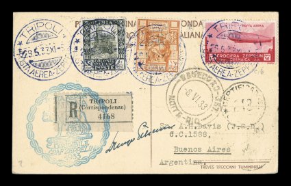 337 c Sieger #212M imageSieger #212M, 1933 Italian Flight, attractive registered view card of an air squadron with 15L Carmine Zeppelin single along with two other adhesives of Lybia tied by scarcer violet "Tripoli/Posta Aerea-Zeppelin/29. 5. 33" c.d.s., flown on the flight around Rome and then on the Second South America Flight to Brazil, with signature of Dr. Hugo Eckener, bluish green Italian flight cachet, backstamped with the Rome machine cancel and Rio de Janeiro c.d.s. then on to Buenos Aires, Argentina, very fine (Sieger €900; Michel #304Ef). (Image) Est. 400-500
