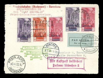338 c Sieger #214C imageSieger #214C, 1933 Second South America Flight, attractively franked card with five overprinted stamps of Cyrenaica tied by "Posta Aerea/(Bengasi)/30. 4. 33" c.d.s. and an air post handstamp, green flight cachet, Friedrichshafen transit c.d.s., posted on the leg for the drop at Barcelona, Spain, backstamped, very fine (Sieger €350; Michel #305Ia). (Image) Est. 200-300
