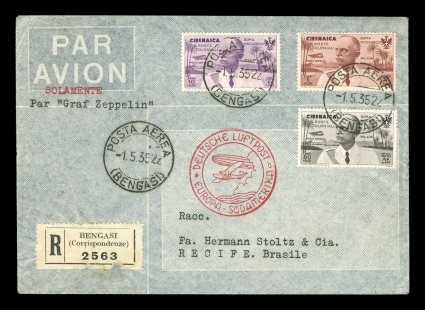 340 c Sieger #299Aa imageSieger #299Aa, 1935 Fourth South America Flight, unlisted Zeppelin flight cover with three values of the 1934 air post semi-postal set tied by "Posta Aerea/(Bengasi)/1. 5. 35" c.d.s., connecting with the Zeppelin through Friedrichshafen via Rome with red general Zeppelin flight cachet with index letter "b" for the Friedrichshafen connection, backstamped Pernambuco, very fine; a late period Zeppelin flight that is listed by neither Sieger nor Michel (Michel #442a). (Image) Est. 400-500