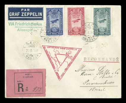 381 c Sieger #235Aa imageSieger #235Aa, 1933 Eighth South America Flight, attractively franked registered cover with five different Ethiopian air posts tied by "Harrar/6. IX. 1933" bilingual c.d.s., violet flight cachet, routed through Friedrichshafen with transit c.d.s., Pernambuco receiving c.d.s. on the front, very fine and choice; an extremely rare Zeppelin cover from this African country possessing great eye appeal (Sieger €1,000; Michel #343a). (Image) Est. 1,000-1,500