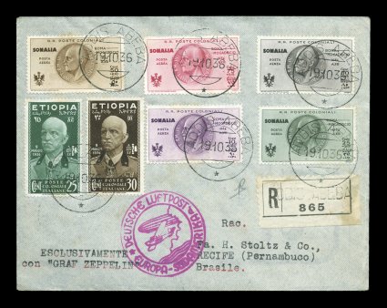 383 c Sieger #373B imageSieger #373B, 1936 Seventeen South America Flight (Twelfth South America Flight of the "Graf Zeppelin"), five air post semi-postals plus two adhesives of Italian Occupation of Ethiopia, all tied by "Addis Abeba/19. 10. 36", magenta general Zeppelin flight cachet, backstamped Pernambuco, very fine and rare; in 1936 when Italy occupied Ethiopia often Italian colony stamps, such as Somalia, were used on the mail and on the rare occasion when Zeppelin mail is found it is offered as Somalia, however this is actually Ethiopia under Italian occupation; Sieger does not list it under either country, Michel lists Ethiopia not noting the Italian occupation (Michel #568). (Image) Est. 500-750