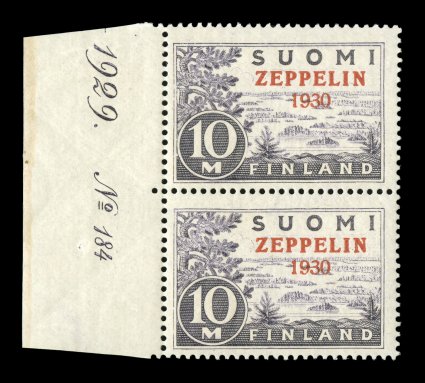 384 nh C1 image#C1, 1930 "Zeppelin/1930" overprint on 10M Gray lilac, attractive left sheet-margin vertical pair with partial imprint and plate no. 184, well centered o.g., n.h., very fine (Facit #165; 3,000SK). (Image) $400.00