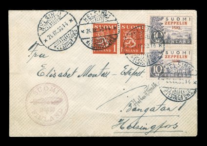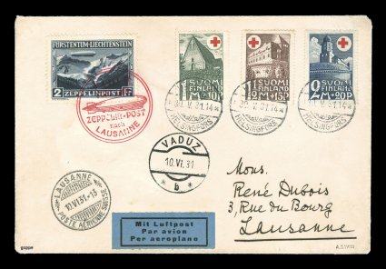 388 c Sieger #110B imageSieger #110B, 1931 Lausanne Flight, unlisted mixed franking posting from Finland, attractively franked cover with complete 1931 semi-postal set tied by "Helsinki/Helingsfors/24. IX. 30" bilingual c.d.s., plus Liechtenstein 2Fr Zeppelin single tied by red Vaduz flight cachet with "Vaduz/b/10. VI. 31." c.d.s., dropped at Lausanne on the same day with that city's receiving c.d.s. on the front, very fine; only Austria, which was a treaty state, is listed posted on this flight, this Finland posting, which required mixed franking, is not noted by Sieger or Michel; signed A. Savini, Gappe (Michel #185Ib). (Image) Est. 750-1,000