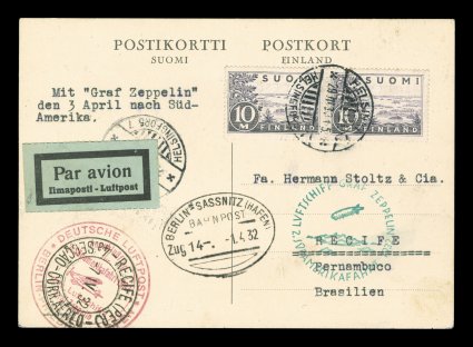 389 c Sieger #143B imageSieger #143B, 1932 Second South America Flight, pair of 10M Deep violet tied to card by "Helsinki/29 III 32" c.d.s., Berlin-Sassnitz railroad transit, green flight cachet and red Berlin connecting flight cachet, backstamped Pernambuco, very fine; this is the first treaty-state posting from Finland listed by Sieger (Sieger €700; Michel #237b). (Image) Est. 200-300