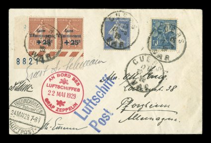 393 c Sieger #026I imageSieger #026I, 1929 Return from Curs of the interrupted America Flight, petite cover with four adhesives of France tied by "Cuers/var/22 -5 29" c.d.s., red on-board cachet of May 22rd and Friedrichshafen receiving c.d.s. of May 24th on front and back, also bearing three signatures of the crew including Dr. Eckener and Ernst A. Lehmann, very fine and choice;ex-Sieger (Sieger €450; Michel #24c). (Image) Est. 200-300