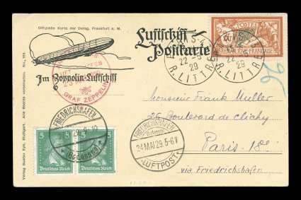 395 c Sieger #026I var. imageSieger #026I var., 1929 Return from Paris of the interrupted America Flight , DELAG card with aerial view of Leipzig, with three French adhesives on front and back tied by "Paris-43/R. Littre/22 -5 29" c.d.s., red on-board cachet of May 23rd, backstamped Friedrichshafen on May 24th, then a pair of German 5pf Green is tied by Friedrichshafen c.d.s. of May 27th for return to Paris, extremely fine; this posting is in a footnote of Sieger which states that there were only ten such cards made, extremely rare (Sieger €650; Michel #24b). (Image) Est. 300-400