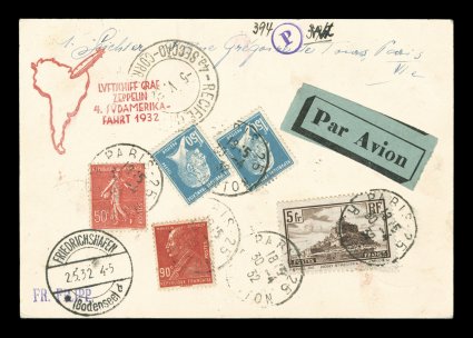 398 c Sieger #157Aa imageSieger #157Aa, 1932 Fourth South America Flight, card with five adhesives tied by "Paris 25/R. Banton/30. 4. 32" c.d.s., Friedrichshafen c.d.s. transit on front and back, orange flight cachet, backstamped Pernambuco, very fine (Sieger €275; Michel #241a). (Image) Est. 150-200