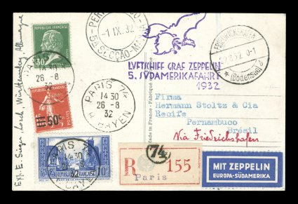 399 c Sieger #171Aa imageSieger #171Aa, 1932 Fifth South America Flight, registered photo card with three adhesives tied by "Paris 74/R. Bayen/26. 8. 32" c.d.s., Friedrichshafen transit c.d.s., violet flight cachet, backstamped Pernambuco, very fine (Sieger €250; Michel #273a). (Image) Est. 200-300