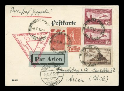 400 c Sieger #238Aaa imageSieger #238Aaa, 1933 Chicago Flight, card with five adhesives including a vertical pair of the 1.50Fr Deep carmine air post tied by "Mulhouse Principal/Haut-Rhin/6 10 33." c.d.s., Friedrichshafen transit c.d.s., red German flight cachet, backstamped Arica, Chile, very fine (Sieger €500; Michel #347a). (Image) Est. 200-300