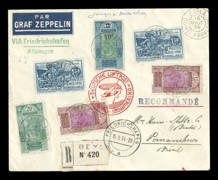 401 c Sieger #274Aa imageSieger #274Aa, 1934 Eighth South America Flight, handsome registered cover with six adhesives tied by "Beyla/Guinei Francaise/16 Aout 34" c.d.s., via Paris and Frankfurt through Friedrichshafen with transit c.d.s., general red flight cachet with index letter "b", backstamped Pernambuco, very fine; Sieger only lists two flights for this small African country, a rare and desirable cover (Sieger €1,100; Michel #401a). (Image) Est. 750-1,000
