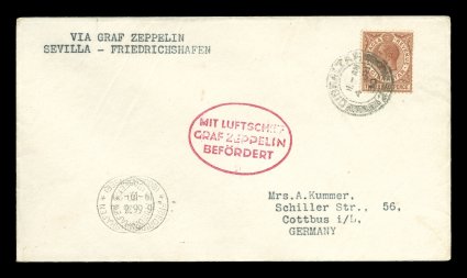 403 c Sieger #64XVI imageSieger #64XVI, 1930 Pan-American Flight, extremely rare cover for the return flight from Seville to Friedrichshafen, 1 1/2p Red brown tied by "Gibraltar/4 JU 30" c.d.s., red oval Zeppelin cachet, backstamped Friedrichshafen, very fine; a total of only ten pieces were posted from Gibraltar, this being one of five covers (Sieger €2,000; Michel #68Ad). (Image) Est. 2,000-3,000