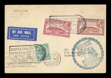 404 c Sieger #207 imageSieger #207, 1933 Italian Flight, three adhesives tied by "Gibraltar/25 MY 33" advertising cancel to card posted on the flight around Rome through the Italian post office (should be Sieger #208) via Tangier, greenish blue Italian flight cachet, Rome machine cancel on the front, very fine; an extremely rare Gibraltar posting, not only being early for this country, but one of the few treaty state postings for the Italian Flight (Sieger €1,500 as #207; Michel #303A; €3,000 for this specific posting). (Image) Est. 1,500-2,000