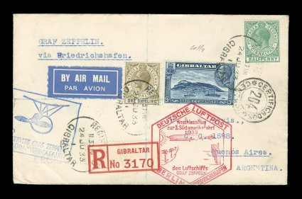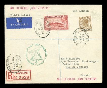 407 c Sieger #286Aa imageSieger #286Aa, 1934 Twelfth South America Flight (Christmas Flight), attractive registered cover with two adhesives tied by "Registered/Gibraltar/20 NO 34" ovals, Berlin transit but with the green flight cachet with index letter "a" for Friedrichshafen, retained on the Zeppelin for the additional leg to Rio de Janeiro, backstamped, very fine and a choice example of this popular flight (Sieger €400; Michel 419). (Image) Est. 200-300