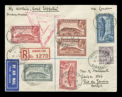 406 c Sieger #238E imageSieger #238E, 1933 Chicago Flight, handsome registered cover with seven adhesives tied by "Registered/Gibraltar/6 OC 33" ovals, red German flight cachet on the front and Berlin connecting flight cachet on the back, backstamped Rio de Janeiro, very fine and attractive cover with eye appeal (Sieger €850; Michel #347b). (Image) Est. 300-400