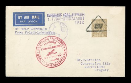 408 c Sieger #138B imageSieger #138B, 1932 First South America Flight, 1/- Bister tied to crisp cover by triangular printed matter pmk., Berlin transit on the reverse, violet flight cachet and red Berlin connecting flight cachet, posted to Montevideo, Uruguay, backstamped, very fine (Sieger €500; Michel #234b). (Image) Est. 150-200