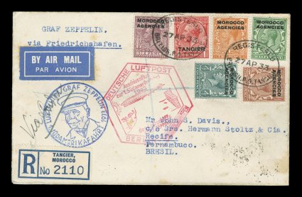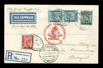 416 c Sieger #219Aa imageSieger #219Aa, 1933 Third South America Flight, fresh registered cover with three "Morocco Agencies" overprints tied by "Registered/British P. O. Tangier/13 JU 33" c.d.s., violet flight cachet, Friedrichshafen transit c.d.s., backstamped Pernambuco, very fine and attractive (Sieger €350; Michel #315a). (Image) Est. 150-200