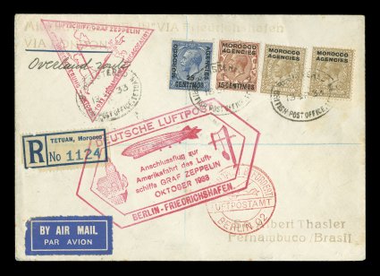 418 c Sieger #226B imageSieger #226B, 1933 Fifth South America Flight, two "Morocco/Agencies" and two "Tangier" overprints tied to registered cover by "Registered/British P. O. Tangier/14 AU 33." ovals, red flight cachet, connecting through Berlin with connecting flight cachet, backstamped Pernambuco, very fine (Sieger €300; Michel #327b). (Image) Est. 200-300
