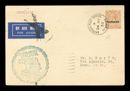 415 c Sieger #207 imageSieger #207, 1933 Italian Flight, 2p Orange "Tangier" overprint tied by "British Post Office/24 MY 33" c.d.s. posted on the flight around Rome through the Italian post office (should be Sieger #208) via Marseilles, greenish blue Italian flight cachet, backstamped with Rome machine cancel, trivial corner crease to card, very fine; an extremely rare treaty state posting on this popular Italian Flight; signed A. D(iena) (Sieger €500 as #207; Michel #303A; €3,000 for this specific posting). (Image) Est. 750-1,000