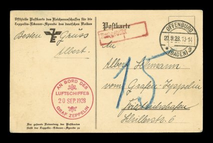 122 c Sieger #021IIb imageSieger #021IIb, 1928 Southwest Germany Flight, Zeppelin-Eckner Fund card with picture of Count von Zeppelin, dropped at Offenburg with clear strike of that city's 20. 9. 28 c.d.s., and equally well struck red on-board cachet of the same date, "15" crayon due marking and boxed "Nachgebuhr" h.s., extremely fine; an exceptionally nice example of this scarce drop (Sieger €500; Michel #2c). (Image) Est. 200-300