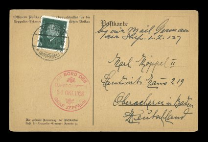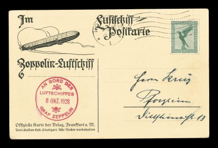 126 c Sieger #21l imageSieger #21l, 1928 America Flight, Zeppelin-Eckner Fund card with multicolor lithographed view of children waving at the Zeppelin, dropped at Radolfzell near the end of the return flight, 8pf Dark green tied by Radolfzell c.d.s., on-board cachet of October 31, 1928, very fine (Sieger €500; Michel #8I). (Image) Est. 200-300