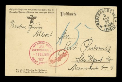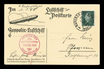 129 c Sieger #022IVb imageSieger #022IVb, 1929 Wurttemberg Flight, Zeppelin-Eckener Fund card showing a portrait of Dr. Eckener, dropped unfranked at Ravensburg with that city's pmk. of February 5, 1929, blue crayon 15(pf) due notation, red on-board cachet of February 4th, choice very fine with clear markings (Sieger €300; Michel #13Ic). (Image) Est. 150-200