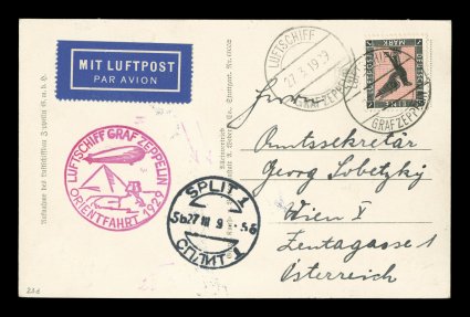 135 c Sieger #23d imageSieger #23d, 1929 Orient Flight, Zeppelin photo card with 1M Air Post tied by on-board cancel of 27. 3. 1929 with additional strike at left, backstamped Split (Croatia) on the same date, Ty. I red lilac flight cachet, all markings are clear and on the address side of the card, extremely fine (Sieger €800; Michel #18IIk). (Image) Est. 300-400