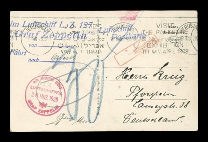 137 c Sieger #23f imageSieger #23f, 1929 Orient Flight, Zeppelin photo card dropped at Jerusalem without franking, addressed to Germany so charged 30(pf) postage due in blue crayon, backstamped with the proper Jerusalem repetitive slogan machine cancel of "27 Mar. 29.8PM" which confirms that this was in the small bag of mail dropped at Jerusalem, also most unusual on this drop is a red on-board cachet of the "Graf Zeppelin" dated 26 Mar. 1929 rather than the usual flight cachet for the Orient Flight, extremely fine; much of the mail that was backstamped Jerusalem on March 27th was actually dropped at the major Er Ramle drop and carried to Jerusalem the same day by rail, the few covers actually dropped at Jerusalem always have this 8 p.m. machine cancel; very rare and seldom offered (Sieger €1,150; Michel #18IIi). (Image) Est. 500-750